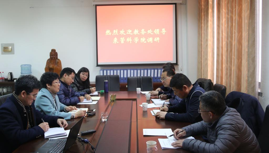 12月27日,学校教务处处长陶虎、副处长许滋坤一行4人来到suncitygroup太阳新城,就校院两级管理中教学管理方面存在问题、下一轮任期目标考核指标设置等进行调研。学院副院长陈浩、刘位龙,院长助理王洪海,部分系主任及教学秘书参加调研。